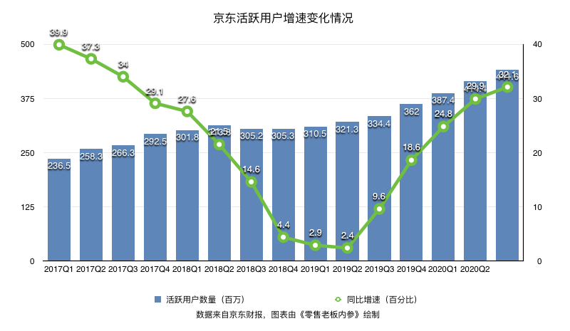 用户数方面倒是增速有所提升,截至2020年9月30日,京东过去12个月的活跃购买用户数达到4.416亿,同比增长32.1%。增速创下过去三年来的新高,上一季度这一数字为29.9%。
