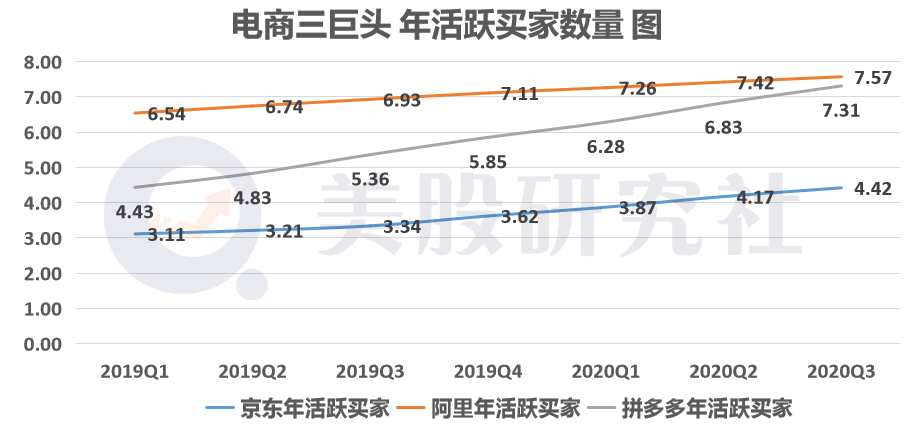 首先,在用户规模方面,京东一直落后于阿里和拼多多。阿里目前处于行业领先位置,而拼多多平台年活跃买家数达7.313亿,同比增长36%。