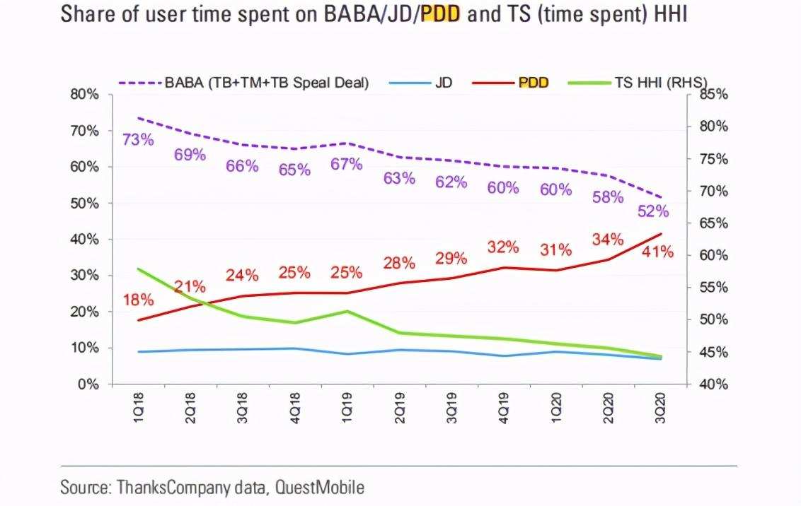 而且京东的用户黏性也不足。高盛近期的报告显示,用户停留在阿里淘系产品的时间最多,而拼多多的用户使用时间达5130亿分钟,已达阿里巴巴的80%。京东则相对较低。