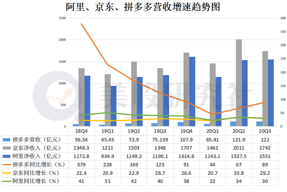对比来看,京东该数据逊色于阿里和拼多多。阿里也出现放缓情况,但拼多多反而取得高增长。