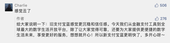 现代 logo 对于颜色的利用也比以往更加先进,前段时间支付宝图标颜色修改就引发了不小讨论,颜色其实是可以影响我们认知的,支付宝官方也曾回复图标颜色事件,表示旧版支付宝的蓝色感觉更沉稳且具备信任感。