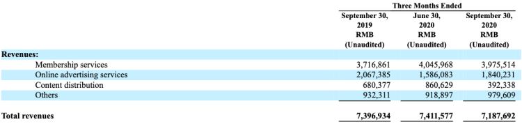 财报显示,第三季度爱奇艺在线广告服务收入为18亿元人民币(约合2.710亿美元),与2019年末持平。