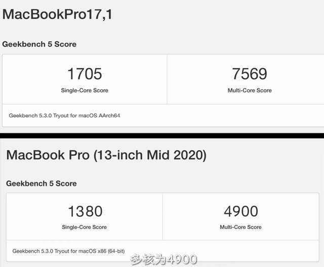 众所周知,Geekbench 5是当下测试CPU性能的重要跑分软件,目前苹果M1芯片的Geekbench 5单核分数普遍在1700以上,多核在7500以上,分数上甚至完虐去年苹果发布的MacBook Pro 16的i9处理器。