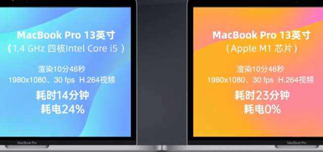 身边一位朋友在对比新旧MacBook Pro 13后发现,M1芯片和英特尔i5芯片在渲染一段时长10分钟以上、1080P、30fps、H.264视频时,英特尔i5芯片所用时间为14分钟,M1则为23分钟。而如果渲染一段利用iPhone拍摄的苹果HEVC编码视频,苹果M1速度明显更快。